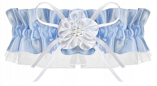 Podwiązka ozdobiona jest podwójną biało-niebieską kokardką i kwiatkiem.