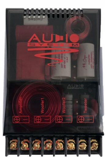 Regulowana poprzez pozłacane zworki na ponad 100 sposobów zwrotnica pozwala zoptymalizować geometrię montażu głośników i właściwości akustyczne konkretnego samochodu.