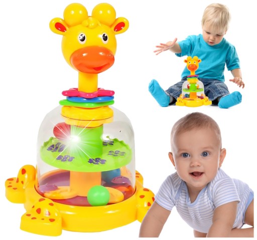 Unowocześniona wersja tradycyjnej zabawki – bączka. Na pewno i Ty pamiętasz z dzieciństwa, jaka to była frajda! Teraz możesz przekazać część swojego dzieciństwa własnemu maluszkowi. Wystarczy, że naciśniesz Ty lub Twoje dziecko główkę żyrafki, a kolorowe kuleczki zaczną się kręcić!