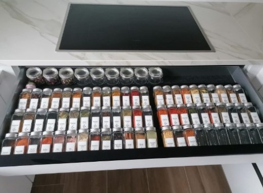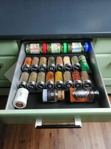 każda przyprawa jest łatwo dostępna i widoczna. Koniec z przeszukiwaniem szuflad w poszukiwaniu tej jednej potrzebnej przyprawy. Teraz każdy słoiczek jest na wyciągnięcie ręki, uporządkowany i gotowy do użycia.