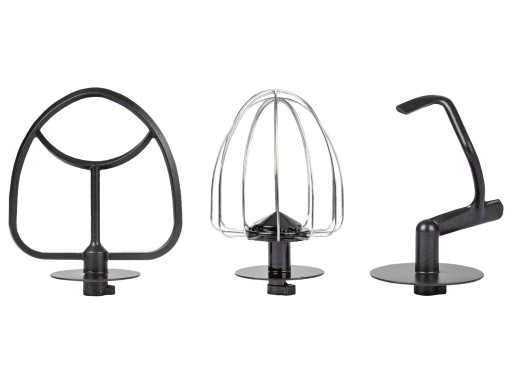 W zestawie: z hakiem do ugniatania, trzepaczką do ubijania, mieszadłem, osłoną przed zachlapaniem i nasadką miksującą