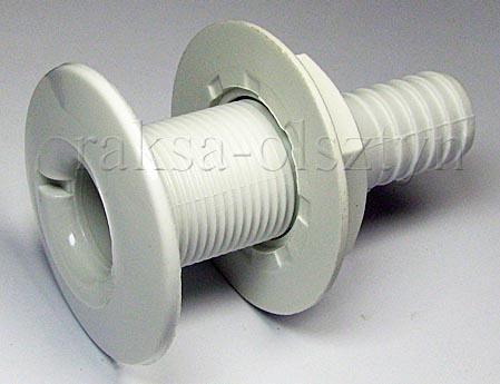 Odpływ - przejście burtowe z króćcem na wąż, wykonane z PVC w kolorze białym.