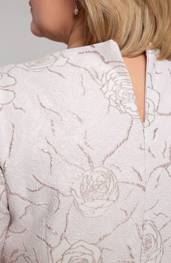 Sukienka, o klasycznym kroju, wykończona jest oryginalnym dekoltem z perłową przypinką i krótkimi rękawkami. Nie posiada poduszek na ramionach. Na plecach ma umieszczony kryty zamek błyskawiczny, co znacznie ułatwi jej dopasowanie do sylwetki. Zaś wszyta podszewka zwiększa komfort użytkowania. Sukienka posiada również klasyczny rozporek, dzięki któremu nie będzie krępowała ruchów podczas poruszania się.