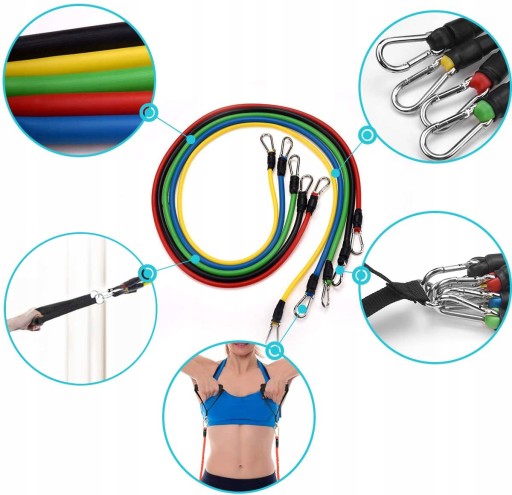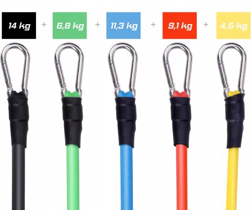 - kolory określające opór poszczególnych gum: - żółty - 4,5kg- zielony - 6,8kg- czerwony - 9,1kg- niebieski - 11,3kg- czarny - 14kg