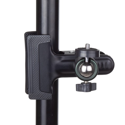 Statyw-klips z głowicą kulową oraz obrotowym uchwytem do telefonu.
