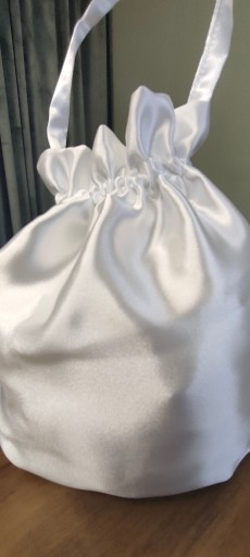 Bardzo dziewczęca torebka komunijna typu woreczek. Wykonana z śnieżnobiałej satyny ślubnej. Woreczek ściągany jest gumką, dzięki czemu mamy pewność, że nic się nie zgubi. Wielkość woreczka dostosowana jest do książeczki komunijnej.