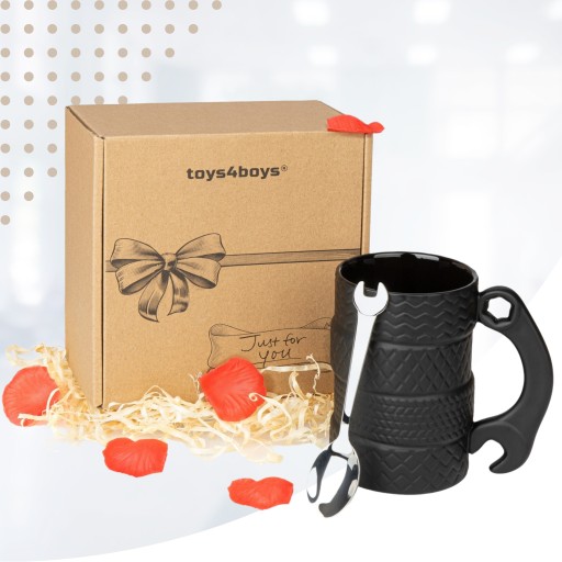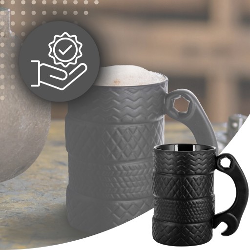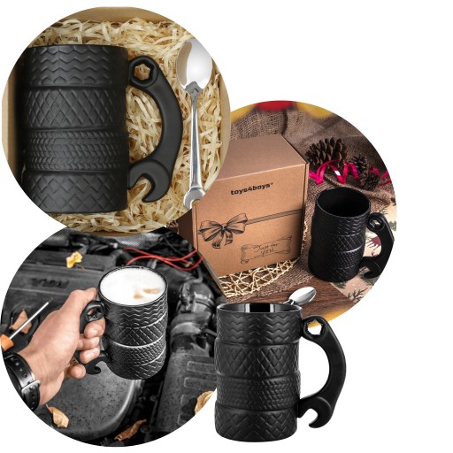 Kubek ma kształt i wygląd czterech opon samochodowych, co sprawia, że jest nie tylko funkcjonalny, ale też wyjątkowo stylowy.