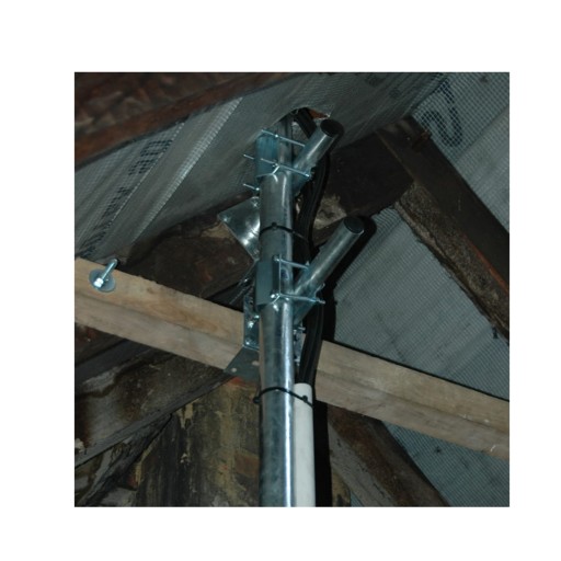 Mocowanie masztu do krokwi dachu składające się z dwóch części, które mocujemy do drewnianych krokwi dachu. Konstrukcja uchwytów wykonana ze stali ocynkowanej ogniowo. Możliwość zamontowania masztu o średnicy 38 mm.