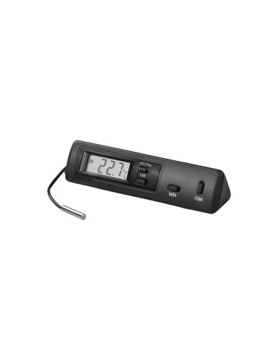 Termometr posiada przełącznik wyboru temperatury wewnętrznej lub zewnętrznej i można go łatwo przymocować za pomocą dwustronnej taśmy klejącej. Termometr posiada czujnik temperatury zewnętrznej o zakresie pomiarowym od -50°C do +70°C. Wewnątrz termometr ma zakres pomiarowy od -10°C do +50°C.