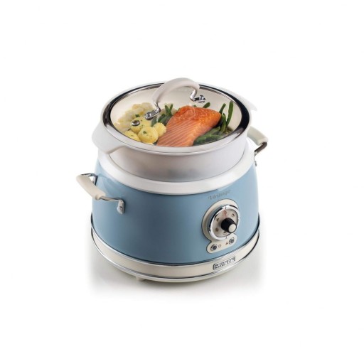 Wolnowar wielofunkcyjny z linii Vintage, moc 700 W, 5 funkcji (wolnowar, gotowanie ryżu, gotowanie na parze, patelnia, podgrzewanie/utrzymywanie temperatury do 24 h), metalowa obudowa, wyjmowana żaroodporna misa z nieprzywierającą ceramiczną powłoką, koszyk do gotowania na parze, miarka, łyżka, uchwyt, wydajność 1,8 l ryżu, pojemność 3,5 l, wymiary 34x29,5x27,5 cm