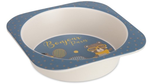 Granatowy zestaw naczyń BONJOUR PARIS to przyjazna dla środowiska alternatywa klasycznych talerzyków i miseczek wytwarzanych z tworzyw sztucznych. Zestaw naczyń został wykonany z solidnych, odpornych, nietłukących się i odpowiednich do kontaktu z pożywieniem materiałów, z wykorzystaniem naturalnych surowcówsurowców – 50% mączki drzewnej i 30% jadalnej skrobi kukurydzianej (oraz 20% żywicy melaminowej). W zestawie znajduje się: talerz, miska, kubek oraz sztućce – widelec i łyżka.