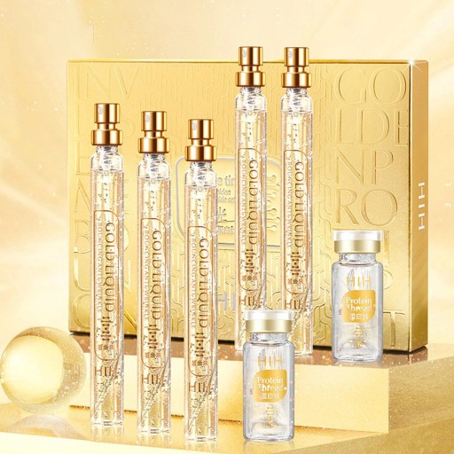 Zastosowanie: po oczyszczeniu nanieść równomiernie złoty płyn na twarz, następnie przyklej linię proteinową razem ze strukturą skóry na twarz i czoło, następnie nanieść złoty płyn na pozycję linii proteinowej i delikatnie wmasować, aż do wchłonięcia.
