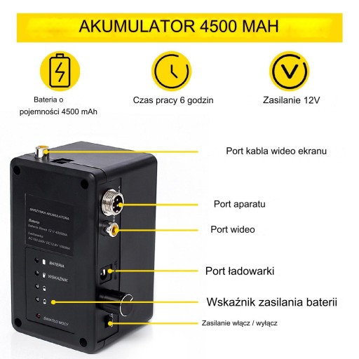 Kamera do rur kanalizacyjnych jest wyposażona w akumulator o dużej pojemności 4500 mAh, który może pracować przez 6 godzin na jednym ładowaniu. Nadaje się do pracy na zewnątrz.