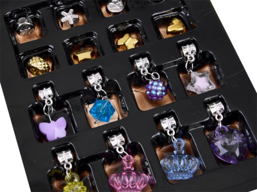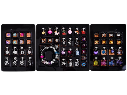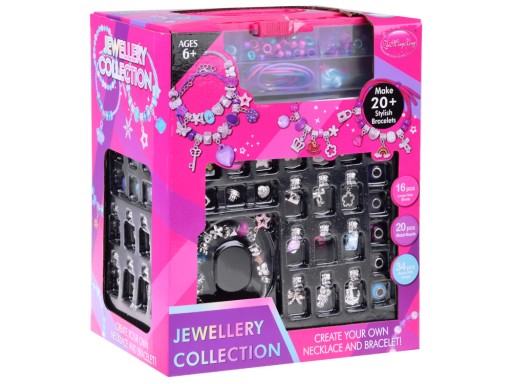 Zestaw zawiera przeźroczysty plastikowy kuferek z przegródkami i lustereczkiem w którym będzie można przechowywać niewykorzystane jeszcze akcesoria do zrobienia biżuterii oraz zrobioną biżuterię. Dzięki uchwytowi, kuferek będzie można z łatwością przenieść w inne miejsce. Kuferek składa się z dwóch elementów, aby rozłożyć kuferek należy po otwarciu wieczka przekręcić dwa różowe zabezpieczenia znajdujące się wewnątrz pudełka.