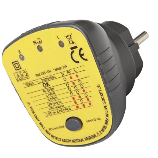 Praktyczny przyrząd, który szybko sprawdza podłączenie gniazda ściennego i działanie wyłącznika różnicowoprądowego oraz przedstawia wynik za pomocą trzech diod świetlnych. W przypadku uziemionych gniazd sprawdza właściwe podłączenie, sygnalizuje brak przewodu uziemiającego, brak przewodu fazowego, brak przewodu neutralnego, zamianę przewodu fazowego z neutralnym, zamianę przewodu fazowego z uziemiającym oraz zamianę przewodu fazowego z uziemiającym przy braku uziemienia. W przypadku nieuziemionych gniazd sygnalizuje brak przewodu fazowego i brak przewodu neutralnego. Instrument jest także wyposażony w funkcję testowania wyłącznika różnicowoprądowego, która sprawdza, czy aktywował się wyłącznik o prądzie różnicowym 30 mA.