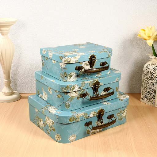 Walizki są wykonane z grubej tektury zapewniającej niezawodną jakość i można je układać w stosy, układać w stosy lub używać pojedynczo. Piękne i delikatne wzory kwiatowe oraz metalowe uchwyty podkreślają wygląd tych pudełek na prezenty. Służy do przechowywania rękodzieła, prezentów, kosmetyków, dokumentów, a nawet kwiatów itp.