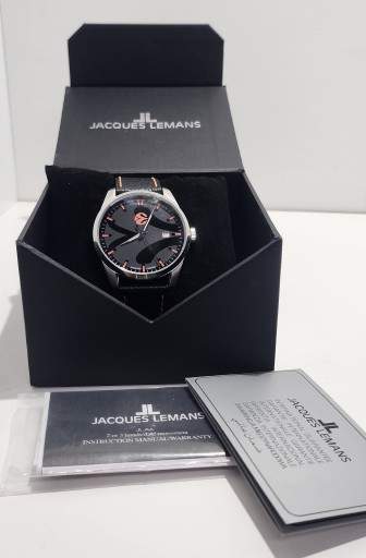 Ten sportowy model Jacques Lemans umiejętnie łączy subtelny sportowy charakter i elegancję. Koperta wykonana jest z solidnej stali nierdzewnej o średnicy 44 mm, skromna czarna tarcza przyciąga wzrok ze względu na indeksy i datownik na godzinie 3. Zegarek posiada mechanizm kwarcowy, hartowane szkiełko crystex, okrągły, wkręcany dekiel oraz wodoszczelność do 10 ATM. Wysokiej jakości skórzany pasek z klamrą dodaje wyrafinowanego wyglądu temu zegarkowi, ten zegarek jest idealnym dodatkiem na każdą okazję.