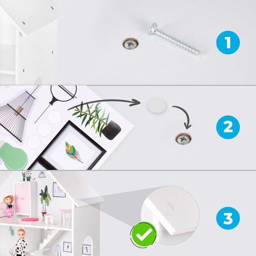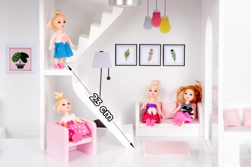 Piękny trzypiętrowy domek jest w pełni wyposażony, posiada duże przestrzenne pomieszczenia, w których bez przerwy można przestawiać piękne drewniane mebelki i akcesoria. Domek w całości pomalowany na biało - połysk.