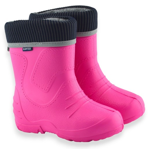 Lekkie, wygodne kalosze dziewczęce w pięknym kolorze fuksji z wyjmowanym ocieplaczem. Łatwe w ubieraniu ,idealne kalosze na deszcz i błoto. Ochronią małe stópki w chłodniejsze dni w drodze do przedszkola i na podwórku.