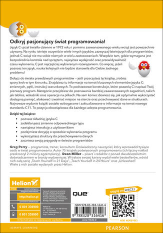 Język C ujrzał światło dzienne w 1972 roku i pomimo zaawansowanego wieku wciąż jest powszechnie używany. Na rynku istnieje oczywiście wiele innych języków, zazwyczaj łatwiejszych dla programistów, jednak C wciąż nie ma sobie równych w wielu zastosowaniach. Wszędzie tam, gdzie wymagana jest bezpośrednia kontrola nad sprzętem, najwyższa wydajność oraz przewidywalność czasu wykonania, C jest najczęściej wybieranym rozwiązaniem. Co więcej, jeżeli poznasz ten język, nauka kolejnych nie będzie stanowiła dla Ciebie żadnego problemu!Dołącz do świata prawdziwych programistów -- jeśli przeczytasz tę książkę, zrobisz spory krok w tym kierunku. Znajdziesz tu informacje na temat kluczowych elementów języka C: zmiennychpętliinstrukcji warunkowych. To podstawowe konstrukcje, które pozwolą Ci napisać Twój pierwszy program. Następnie przejdziesz do poznawania bardziej zaawansowanych zagadnień, takich jak tablicewskaźniki oraz operacje na plikach. Na sam koniec dowiesz się, jak optymalnie wykorzystać dostępną pamięć, alokować oraz zwalniać miejsce na stercie oraz przechowywać dane w strukturach. Najnowsze wydanie książki zostało wzbogacone i zaktualizowane o informacje na temat nowego standardu C11. Ta książka jest pozycją, która sprawdzi się w rękach każdego adepta programowania.Oto lista niektórych opisanych zagadnień: