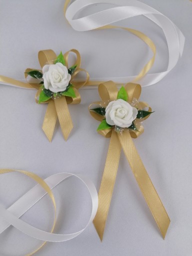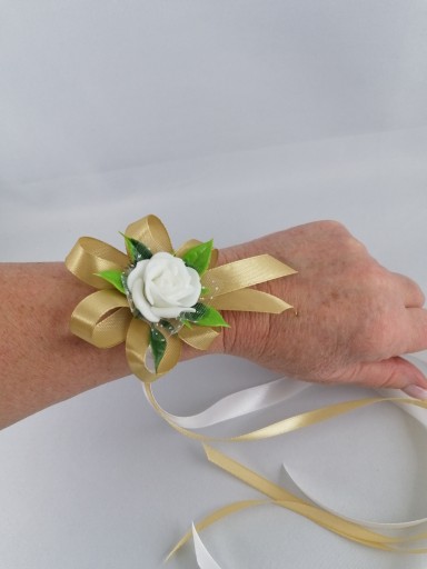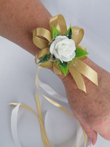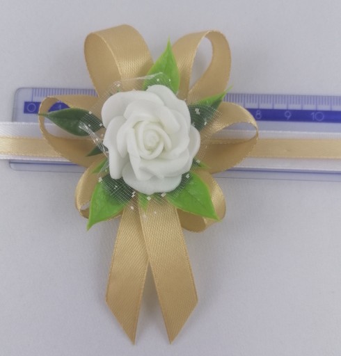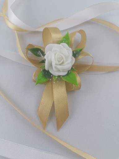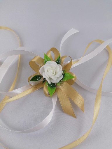- kwiat w kolorze białym upięty na satynowych tasiemkach /12 i 6 mm, złotej i białej/