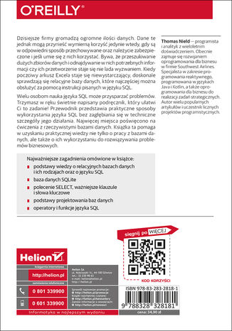 Dzisiejsze firmy gromadzą ogromne ilości danych. Dane te jednak mogą przynieść wymierną korzyść jedynie wtedy, gdy są w odpowiedni sposób przechowywane, należycie zabezpieczone i jeśli się umie z nich skorzystać. Bywa, że przeszukiwanie dużych zbiorów danych i odnajdywanie w nich potrzebnych informacji czy ich przetworzenie staje się nie lada wyzwaniem. Wtedy, gdy poczciwy arkusz Excela staje się niewystarczający, doskonale sprawdzają się relacyjne bazy danych, które najczęściej można obsłużyć za pomocą instrukcji pisanych w języku SQLWielu osobom nauka języka SQL może przysparzać problemów. Trzymasz w ręku świetnie napisany podręcznik, który ułatwi Ci to zadanie! Przewodnik przedstawia praktyczne sposoby wykorzystania języka SQL bez zagłębiania się w techniczne szczegóły jego działania. Najwięcej miejsca poświęcono na ćwiczenia z rzeczywistymi bazami danych. Książka ta pomaga nie tylko w uzyskaniu praktycznej wiedzy o pracy z bazami danych, ale także o ich wykorzystywaniu do rozwiązywania problemów biznesowych.Najważniejsze zagadnienia omówione w książce: