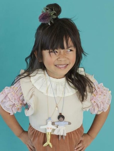 Ten naszyjnik jest absolutnie uroczy! Składa się z pięknie wykonanej lalki o imieniu Sophia i złotego łańcuszka z koralików. Lila jest wykonana z bawełny, ma złoty syreni ogon.