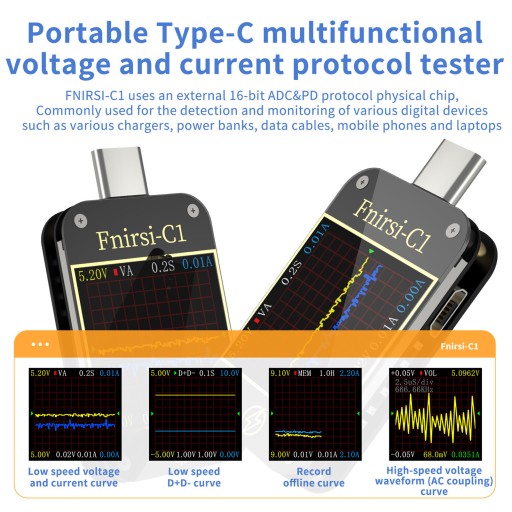 1. FNIRSI-C1 ma podwójne interfejsy typu C, jest inteligentny, ma zróżnicowane funkcje, obsługuje test wysokoprądowy 6,5A i działa stabilnie przez długi czas.