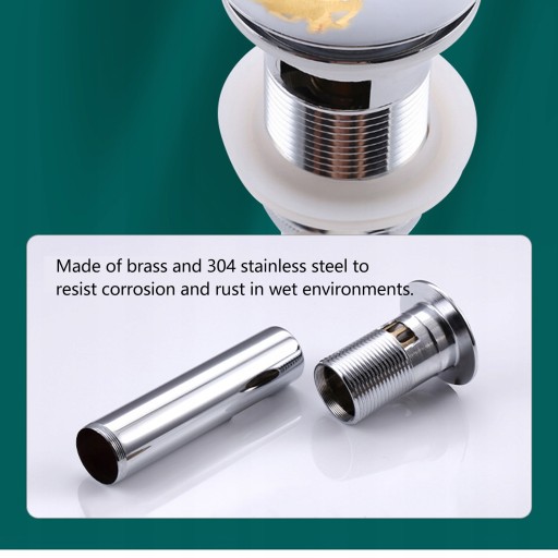 1. Mosiądz: Korek do zlewu, filtr do zlewu i kołnierz korka spustowego do zlewu są wykonane z mosiądzu, co może zapobiegać korozji i rdzy w wilgotnych warunkach.