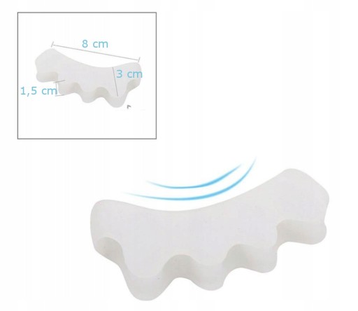 Wymiary separatora przed rozciągnięciem i nałożeniem na stopę. Pamiętaj, że podczas nakładania separator dostosuje się do każdej, nawet najszerszej stopy!