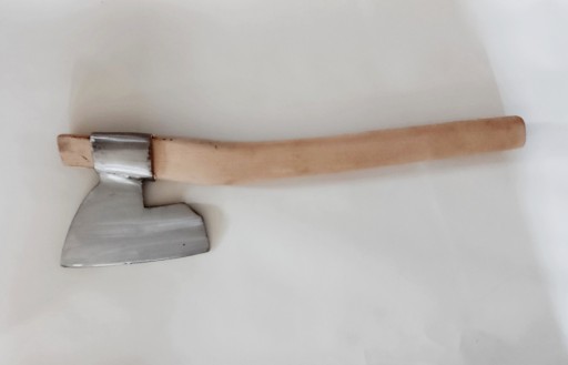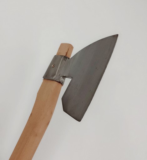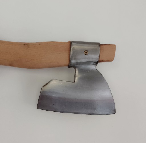 Przedmiotem aukcji jest kolekcjonerski topór masarski, wykonany z blachy 40 HM o grubości 8 mm, ulepszanej cieplnie, polerowanej, konserwowanej olejem jadalnym.