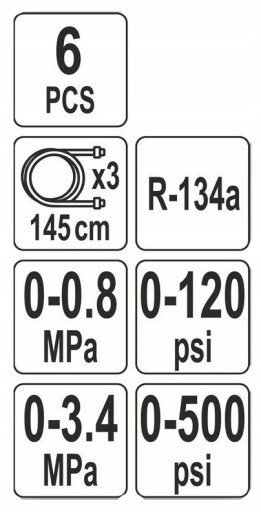 Zestaw do obsługi klimatyzacji niskociśnieniowej w zakresie 0-0.8 MPa, 0-120 psi oraz wysokociśnieniowej w zakresie 0-3.4 MPa, 0-500 psi