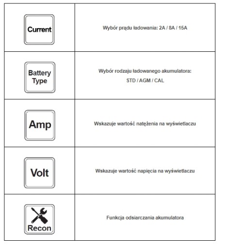 - Prąd ładowania: 2A / 8A / 15A (12V)