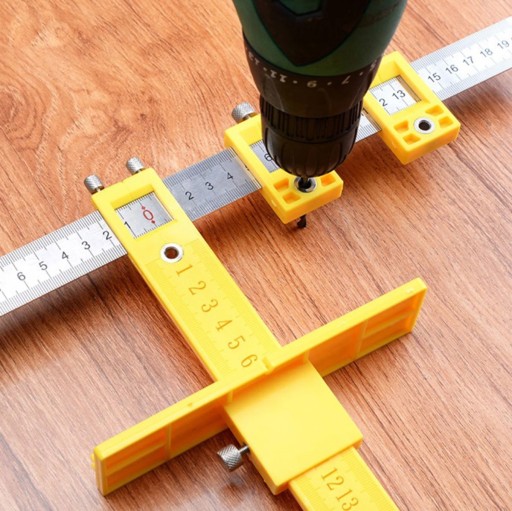 - Posiada dwie ruchome miarki (poziomą i pionową) z podziałką centymetrową oraz otwory do wiercenia o średnicy 5 mm.