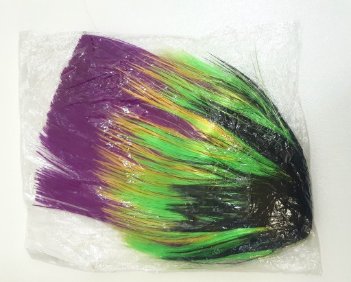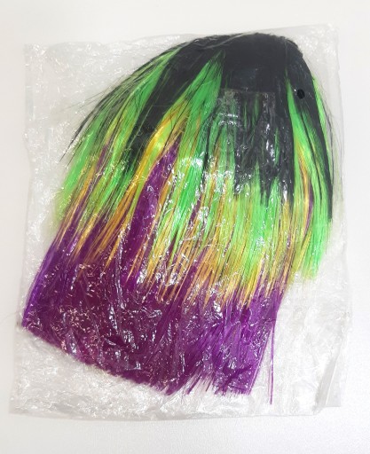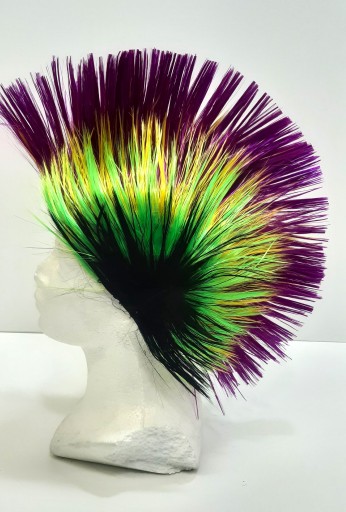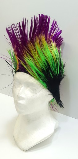 Peruka irokez czarno-zielono-żółto-fioletowe. Przez środek głowy postawione są włosy na wysokość 18 cm. Po bokach imitacja wystrzyżonych włosów ułożonych tak iż całą głowa jest w wymienionych wcześniej kolorach, a siatka mocująca jest praktycznie nie widoczna (gęsto rozmieszczone kosmyki). Można nanosić na perukę drobne poprawki za pomocą lakieru do włosów lub żelu w zależności od potrzeb i upodobań.