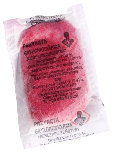 Trutka przeznaczona do zwalczania myszy (Mus musculus) i szczurów (Rattus norvegicus, Rattus rattus), wewnątrz i wokół budynków oraz na terenach otwartych