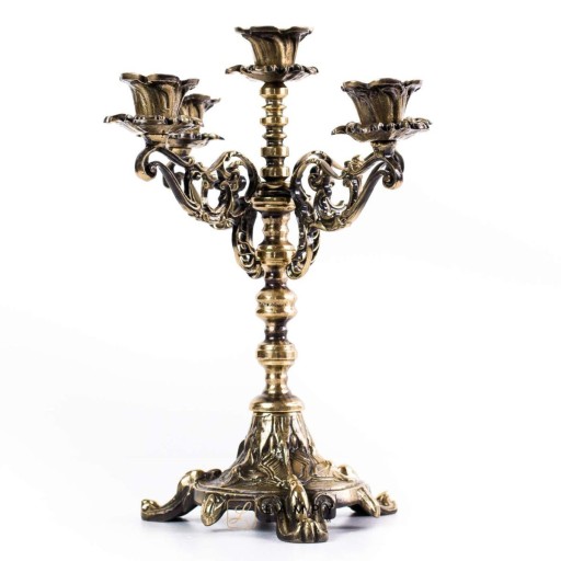 5-ramienny świecznik utrzymany w antycznym charakterze ,przepolerowany w miejscach eksponowanych , ciemniejszy w zakamarkach. Oryginalne wzornictwo produktu sprawia, że wspaniale prezentuje się we wnętrzach tradycyjnych oraz nowoczesnych. Mosiężny świecznik został pokryty lakierem zapobiegającym utlenianiu się mosiądzu.
