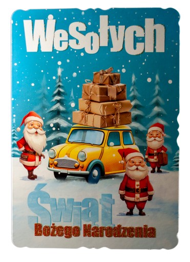 Kartki są rozkładane, delikatnie zdobione brokatem, wewnątrz kartki umieszczone są życzenia