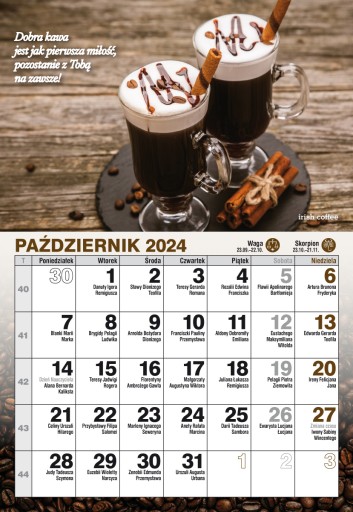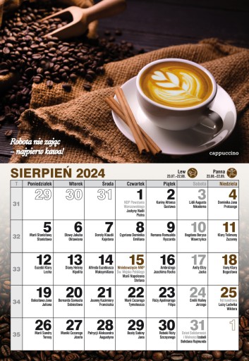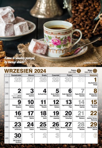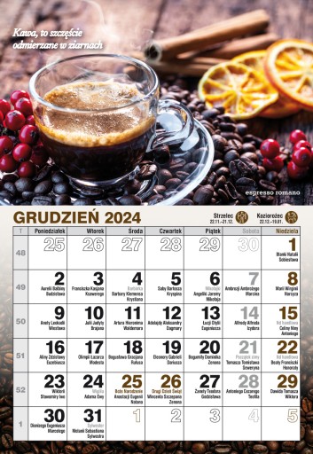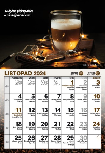 Każdy miesiąc ozdobiony innym zdjęciem w baristycznych klimatach i "kawowym" mottem.