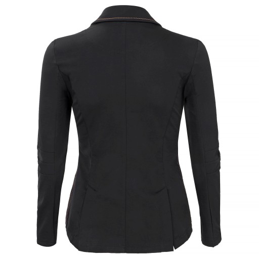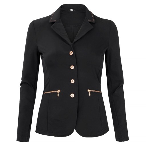 Elegancki frak, który przyciągnie spojrzenia sędziów i widzów w trakcie zawodów. Wykonany jest z elastycznego materiału, który świetnie dopasuje się do sylwetki i podkreśli talię. Uroku dodają mu piękne, błyszczące guziki w kolorze różowego złota z zatopionymi drobinkami brokatu. Dodatkowymi zdobieniami są zamki i przeszycia pod kolor guzików. Frak zapinany jest na zamek i guziki oraz zawiera dwie kieszenie z przodu zapinane na zamek. Dostępny jest w dwóch wariantach kolorystycznych, które pięknie komponują się z różowym złotem - granatowy oraz czarny.