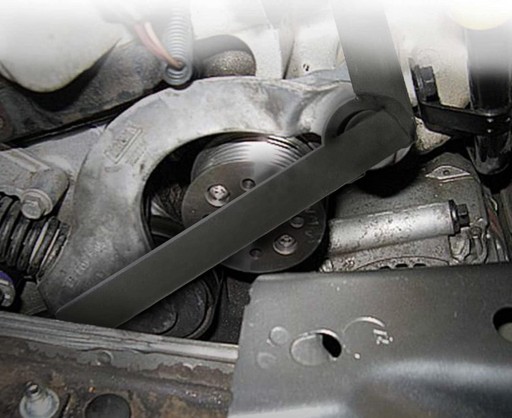 Specjalistyczne narzędzie przeznaczone do luzowania koła pasowego wałka rozrządu, a następnie blokowanie napinacza koła pasowego za pomocą sworznia wałka rozrządu, umożliwiając demontaż i wymianę paska rozrządu w samochodach Mini Cooper S z silnikami BMW W11.