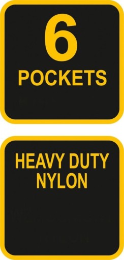 Pas narzędziowy z dwiema przesuwanymi sakwami po trzy kieszenie i dodatkowe przegródki każda, Posiada zawieszkę na miarkę i pętle na młotki. Można dokładać inne elementy. Lekki wodoodporny pas z zatrzaskową klamrą. Materiał poliester.