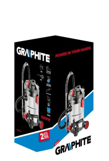 Wysokiej klasy odkurzacz warsztatowy GRAPHITE (nr ref. 59G607) z silnikiem o mocy 1500 W, przeznaczony do szybkiego i skutecznego usuwania urobku po pracach warsztatowych. Odkurzacz z pojemnym 30 litrowym zbiornikiem ze stali nierdzewnej może pracować zarówno na sucho jak i na mokro. Duża siła ciągu wynosząca 18kPa oraz średnica końcówki węża ssącego 35 mm dają odkurzaczowi możliwość uprzątnięcia różnego rodzaju odpadów. Odkurzacz posiada również funkcję nadmuchu. Ponadto urządzenie zostało wyposażone w pływakowy zawór bezpieczeństwa przy pracy na mokro i korek spustowy brudnej wody. Duże tylne kółka jezdne oraz zabezpieczone wspornikami przednie kółka pozwalają urządzeniu na bezpieczne przemieszczanie się w trudnych warunkach. Istnieje możliwość podłączenia dodatkowych elektronarzędzi o maksymalnej mocy 2000 W do gniazda przyłączeniowego odkurzacza. Trójpozycyjny włącznik daje możliwość startowania odkurzacza z poziomu podłączonego urządzenia lub samodzielnej pracy odkurzaczem. Urządzenie wyposażono w metalową rurę z możliwością regulacji długości. Wymienne nasadki robocze przechowywane są w podstawie urządzenia. Urządzenie wyposażono w elastyczny i wytrzymały przewód zasilający w powłoce gumowej o długości 4m, dedykowany także do zastosowań profesjonalnych i przemysłowych zarówno wewnątrz jak i na zewnątrz pomieszczeń. W zestawie z odkurzaczem znajdują się także: wąż ssący, końcówki robocze, rura teleskopowa, worek na pył, membrana piankowa, filtr, zaczepy przewodu zasilającego i adapter. Zgodność z europejskimi standardami zapewnia certyfikat CE.