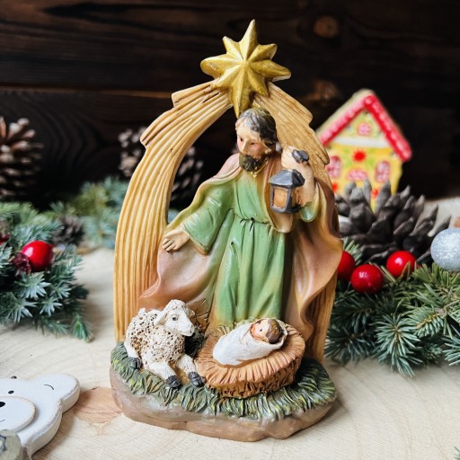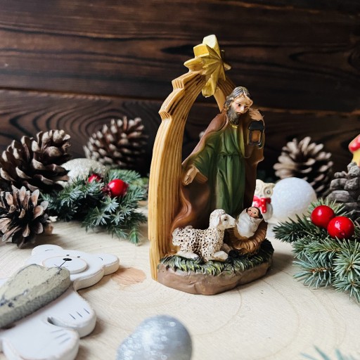 - Nasza piękna szopka, ozdobiona blaskiem gwiazdy betlejemskiej, to esencja świątecznego uroku. Figurka przedstawia Świętego Józefa z dzieciątkiem i owieczką.