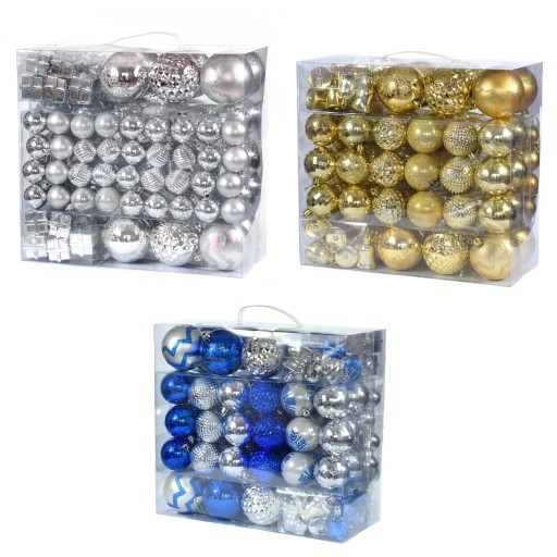 Oferujemy niezwykły komplet bombek, który nie tylko udekoruje Twoją choinkę, ale także wniesie do Twojego domu świąteczny blask i urok. Cena obejmuje pełen zestaw 116 bombek, każda z zawleczką i sznureczkami, gotową do zawieszenia!