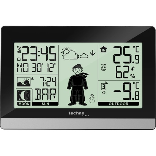 Dzięki tej przejrzyście rozmieszczonej radiowej stacji meteorologicznej masz zawsze wgląd w sytuację pogodową. Prognoza sytuacji pogodowych jest wskazywana przez meteorologa (ubiera się zgodnie z pogodą). Czas i data są aktualizowane za pomocą sygnału DCF77 wysyłanego przez zegar atomowy.