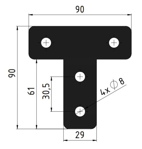 - Do łączenia za pomocą wielu rodzajów nakrętek M8. (W zależności od stosowanych profili: nakrętki dedykowane do profili konstrukcyjnych, standardowych nakrętek sześciokątnych)