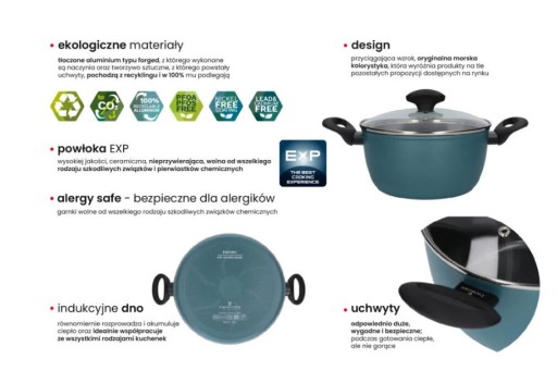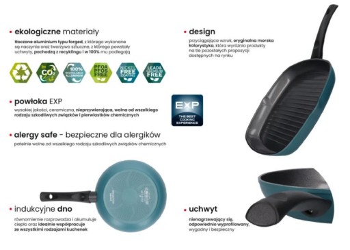 Patelnie ENVIRO powstały z szacunku do środowiska i z myślą o jego ochronie. Zaczynając od użytych materiałów, poprzez proces produkcji, a na rodzaju opakowania kończąc, patelnie ENVIRO są odpowiedzią zarówno na potrzeby konsumentów, jak i środowiska. Tłoczone aluminium typu forged, z którego są wykonane oraz tworzywo sztuczne, z którego powstają uchwyty, pochodzą z recyklingu i w 100 % mu podlegają. Dodatkowo pudełko i folia, stanowiące zabezpieczenie transportowe, jak i opakowanie produktu są całkowicie biodegradowalne. Zastosowana w patelniach ceramiczna, nieprzywierająca powłoka EXP jest wolna od wszelkiego rodzaju szkodliwych związków i pierwiastków chemicznych: PFOA, PFOS, niklu, ołowiu, kadmu oraz pozostałych metali ciężkich. Co więcej, patelnie równomiernie rozprowadzają i akumulują ciepło oraz idealnie współpracują z wszystkimi rodzajami kuchenek, w tym indukcyjnymi. Całości dopełnia przyciągająca wzrok, oryginalna, morska kolorystyka. Poza czynnikami ekologicznymi patelnie ENVIRO spełniają także restrykcyjne normy jakościowe, które są gwarancją satysfakcji nawet najbardziej wymagających klientów.