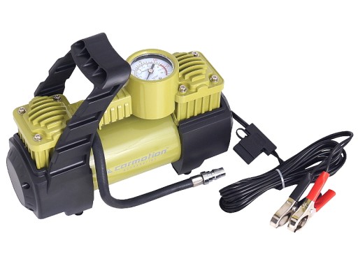 Kompresor posiada dużą moc, dlatego może być zasilany z akumulatora 12V - posiada przewód z zaciskami (krokodylkami). Służy do napompowania opon bez konieczności demontażu koła, co wpływa na komfort i pozwala zaoszczędzić czas. Wyposażony w gumowy wąż o długości 1m oraz dodatkowy wąż spiralny o długości 5m.