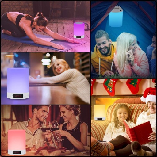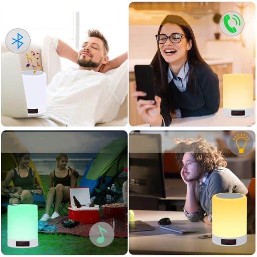 ♫ 【Sterowanie dotykiem ciepłe światło i 7 kolorowych światełek 】 ♫ Poprzez krótkie dotknięcie górnej kratki (głośnik), lampa LED można ustawić 3 poziomy jasności (niska, średnia i wysoka). Naciskaj przez długi czas na górną kratkę, można przełączać na 7 kolorowych świateł do wyboru, aby uzyskać stałe lub inny kolory.